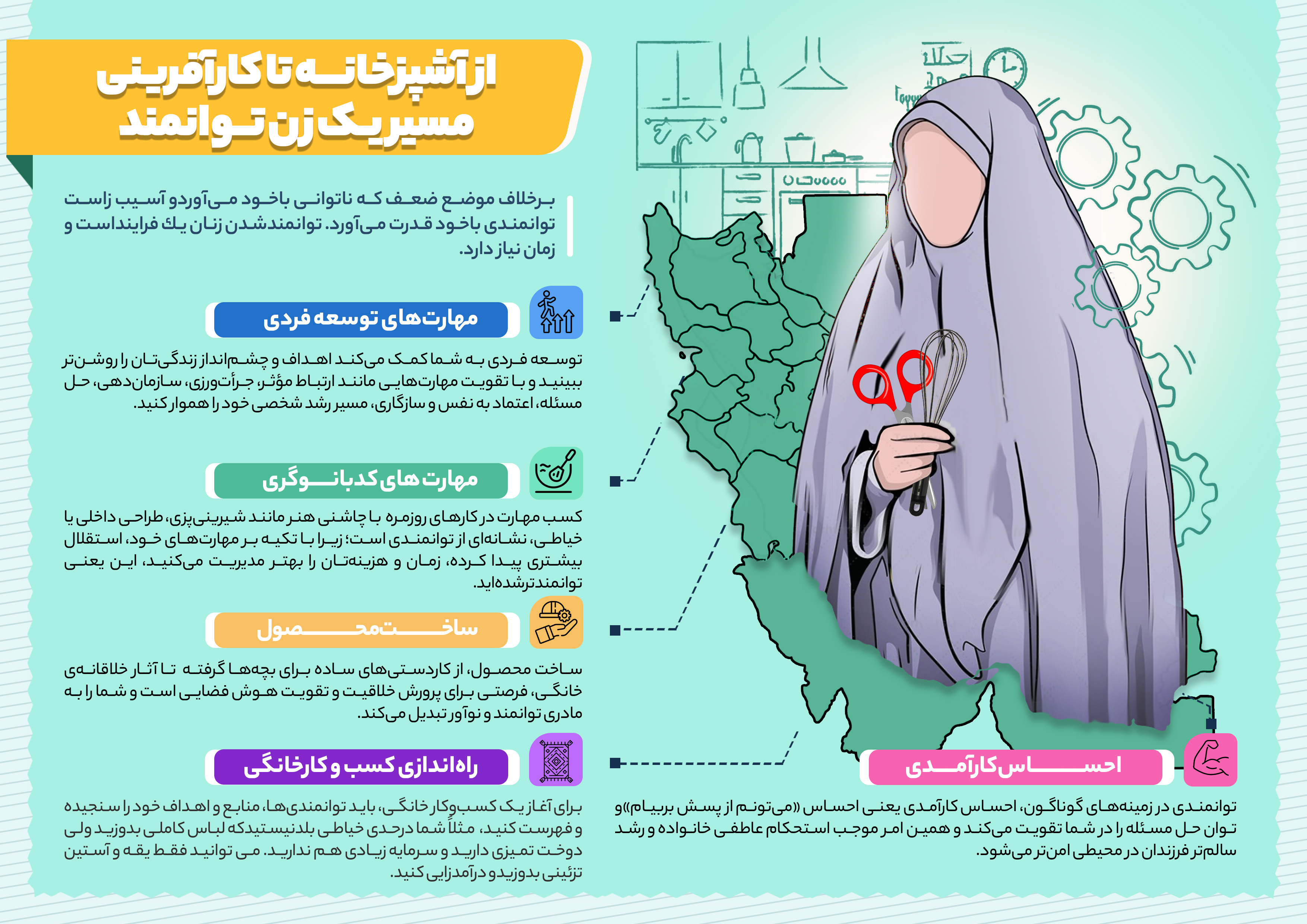 به گزارش روژآوا ؛ اینفوگرافیک از آشپزخانه تا کارآفرینی مسیر یک زن توانمند